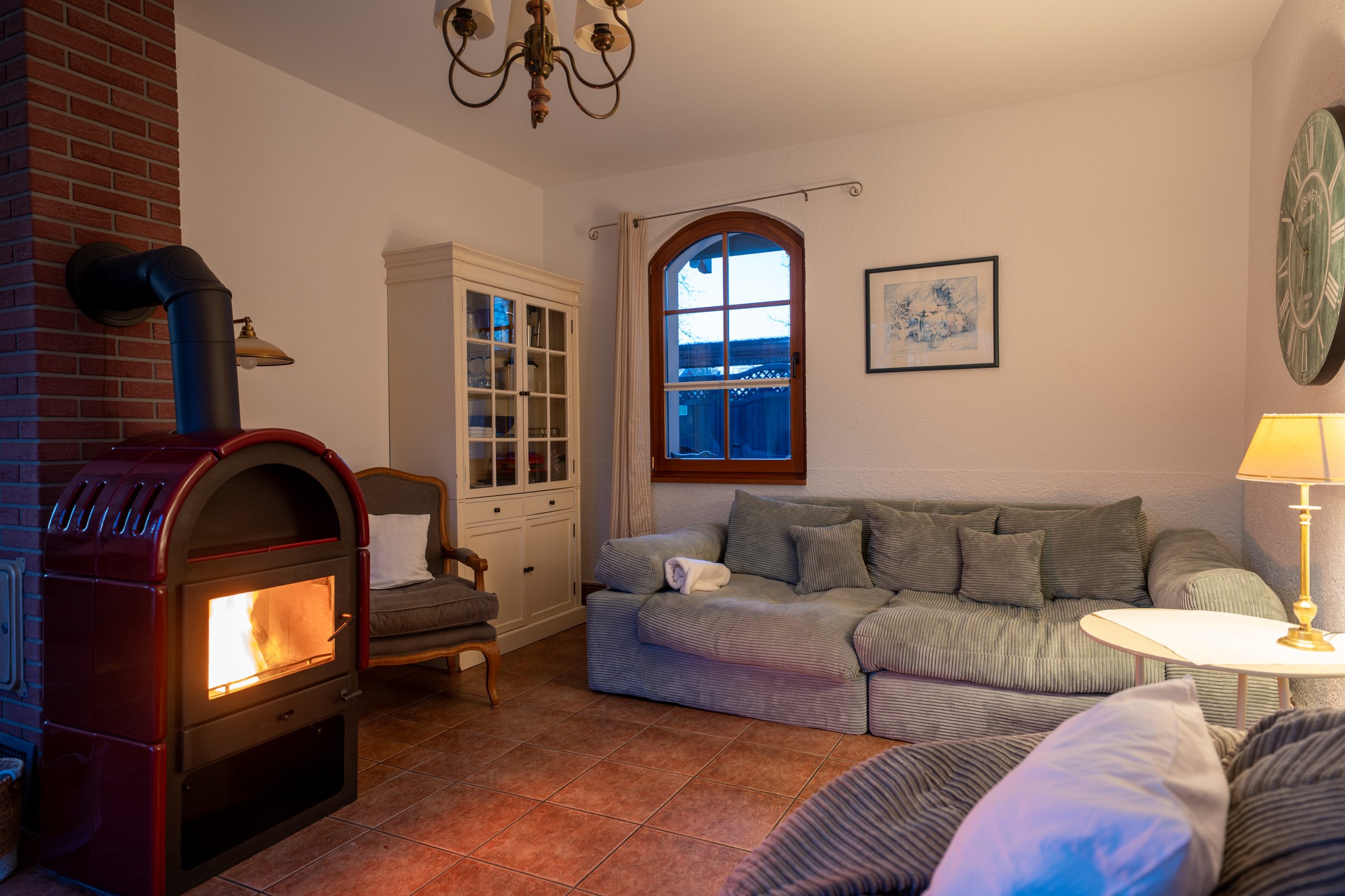 Im offenen Wohnbereich erwartet dich ein stilvoll eingerichtetes Atelier mit gemütlichem Sofabereich, Smart-TV, romantischem Kerzenleuchter und direktem Zugang zur sonnigen Terrasse mit Blick ins Grüne – perfekt für Frühstück im Freien oder entspannte Abendstunden.